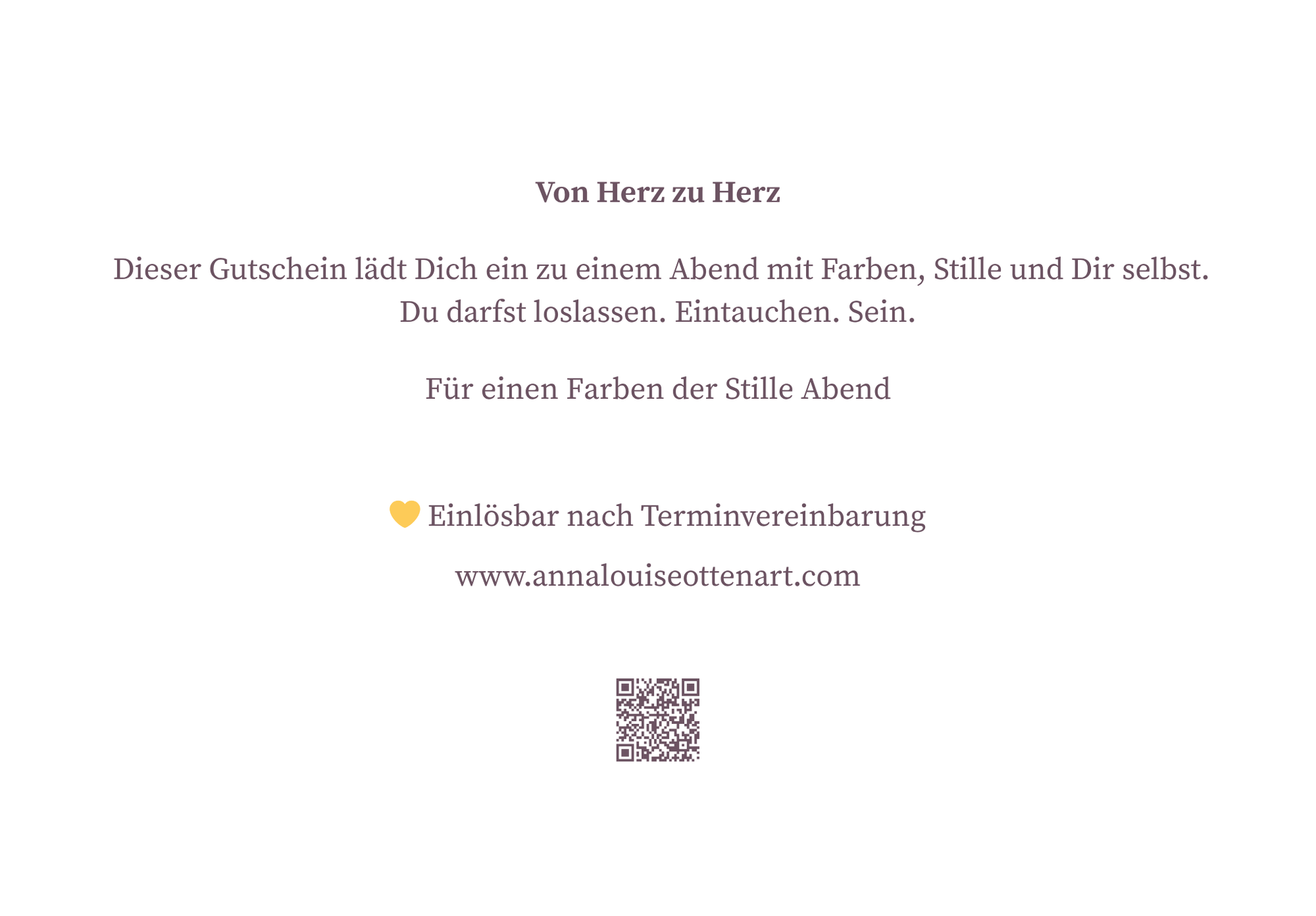 - Rückseitentext: „Von Herz zu Herz – Dieser Gutschein lädt Dich ein zu einem Abend mit Farben, Stille und Dir selbst. Du darfst loslassen. Eintauchen. Sein.“